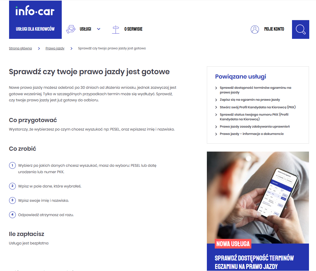 Jest to miejsce, w którym możesz dokonać sprawdzenia prawa jazdy pod względem jego statusu. Wystarczy podać kilka danych osobowych, aby upewnić się, że Twoje „prawko” czeka na Ciebie w odpowiednim urzędzie i jest gotowe do odbioru. Korzystanie z serwisu jest w pełni bezpłatne, co z pewnością ucieszy wszystkich świeżo upieczonych kierowców, którzy już i tak ponieśli spore wydatki na uzyskanie uprawnień.